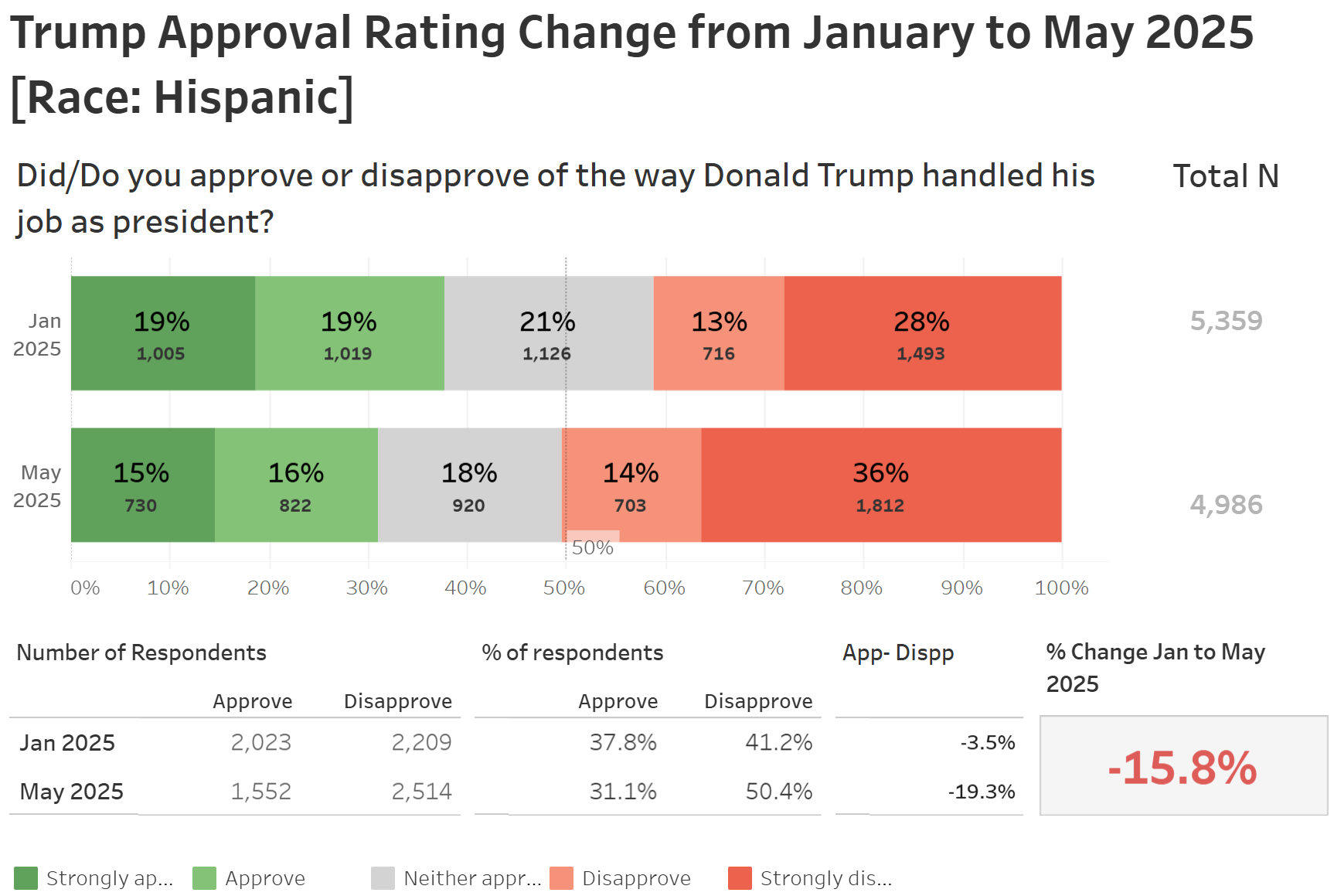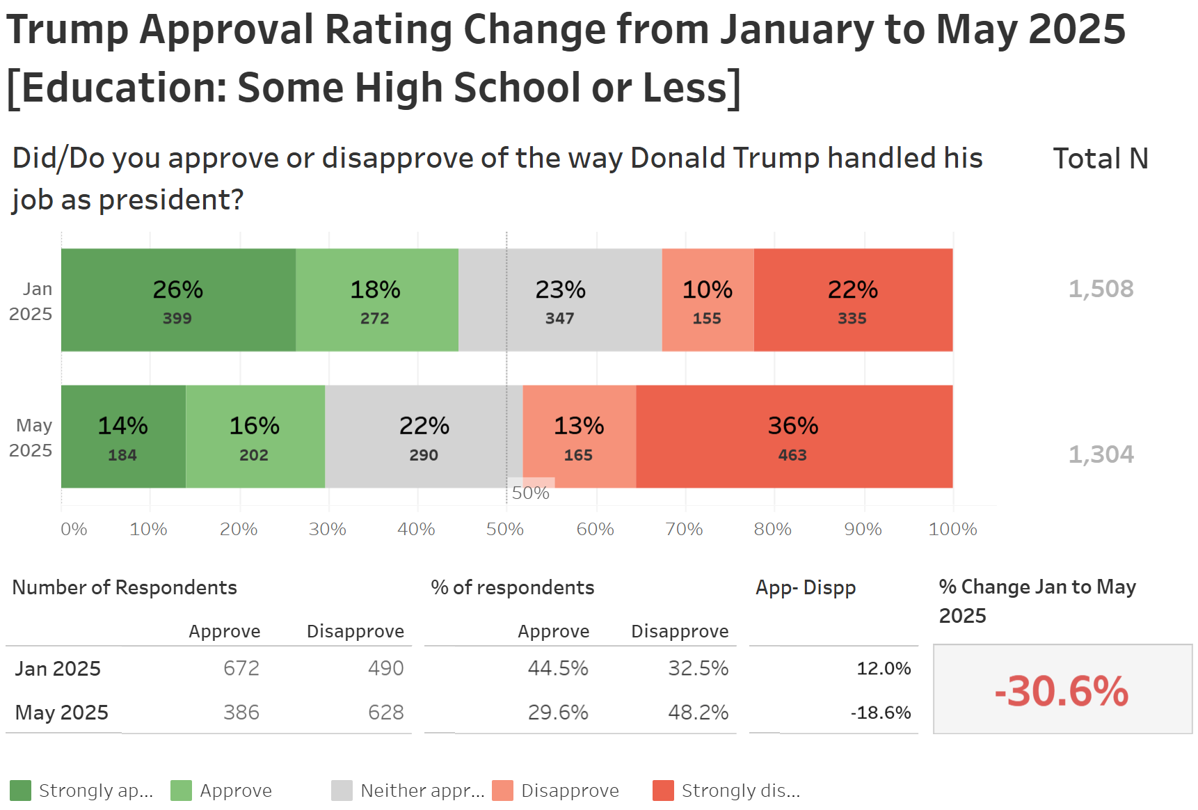 We have an interactive tool that will allow the user to examine support among narrower slices of respondents. The scale of the data allows slicing the subsets of respondents into fairly small categories while retaining some statistical power. For example, if you look at 30 and under Hispanic women with “some high school or less” education, approval of Trump has dropped 42.8%; for non-strong Republicans 30 and under with high school or less education, approval has dropped by 36%.