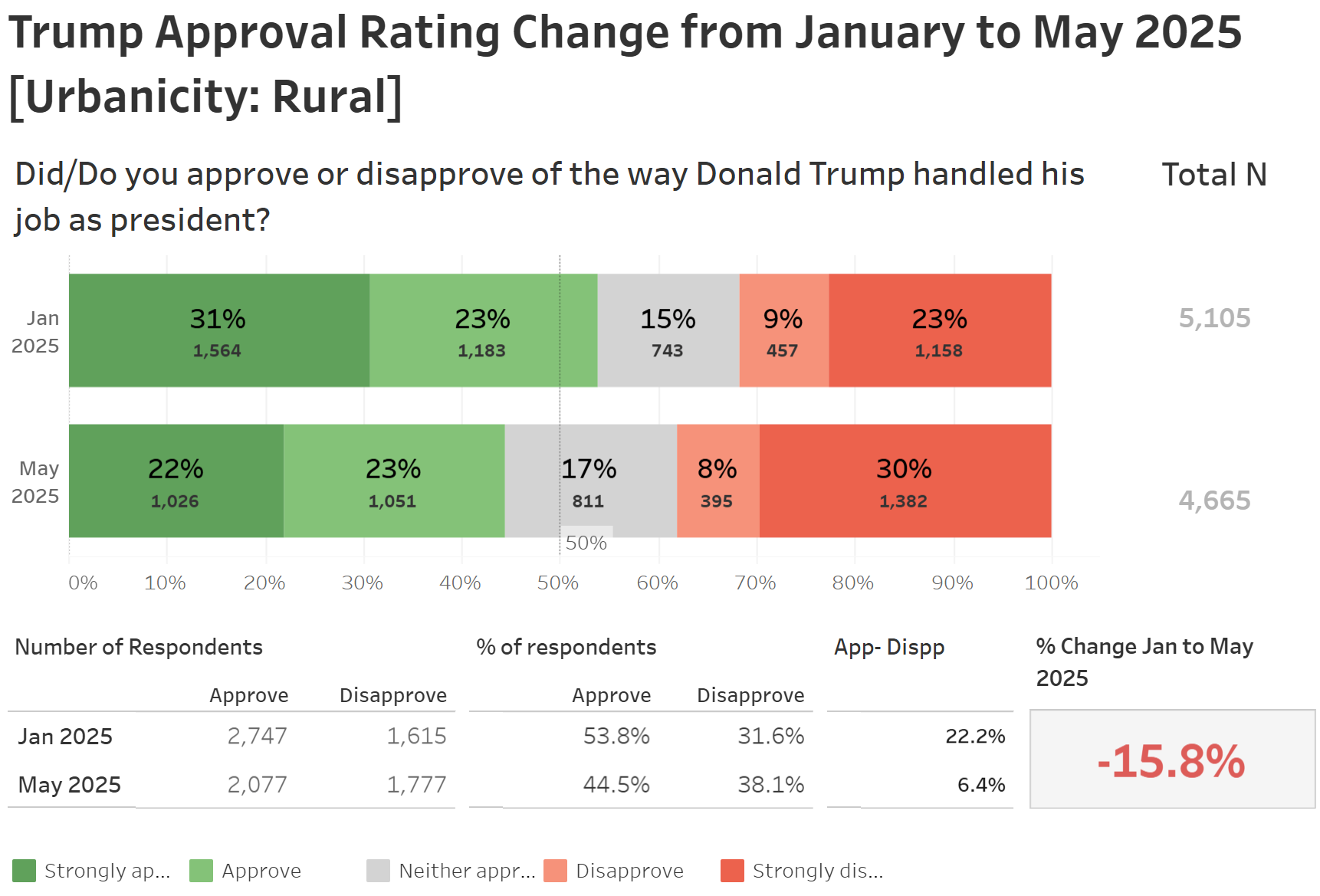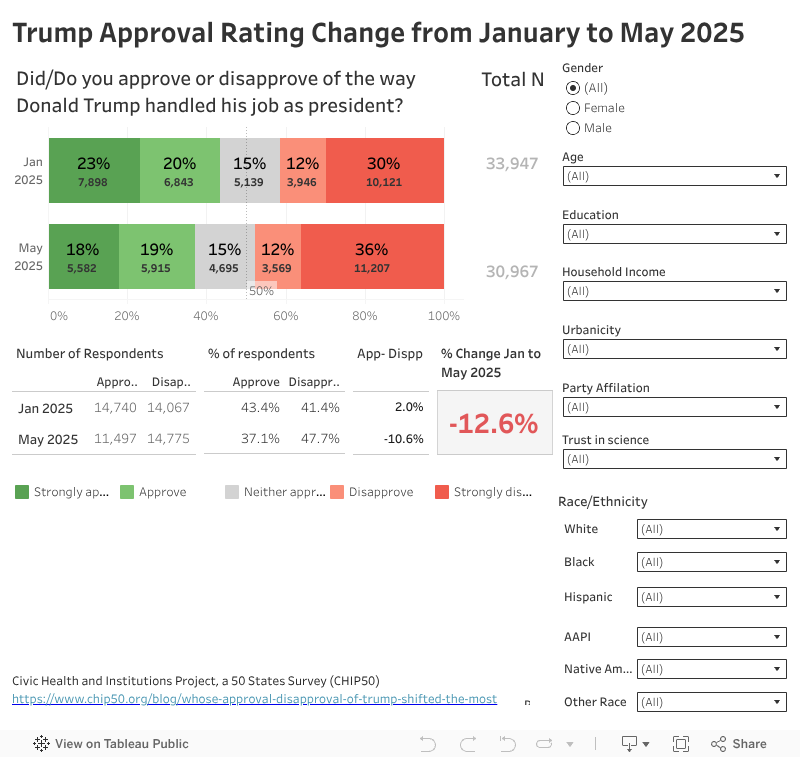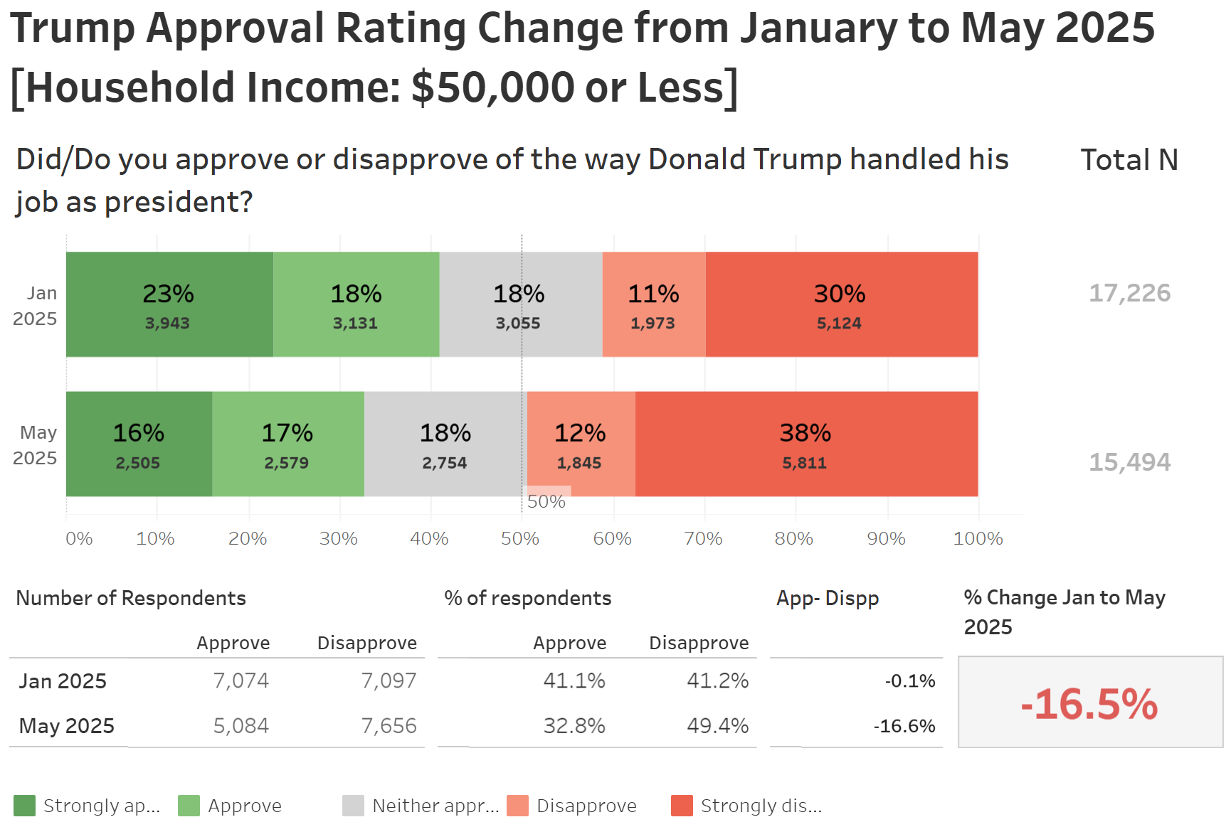 A long list of polls show that approval of Donald Trump has slipped since he was inaugurated. Our analysis comparing Trump’s approval rating from right before he was inaugurated to the present suggests the same. Overall, his net approval (Percent approve minus percent disapprove) was positive in early January 2025, at +2%; that has dropped to -10.6%, for a drop in net approval of 12.6%. Because of the scale of CHIP50, we can evaluate which slices of public approval have changed the most. We note that our surveys are large-scale and take place over extended periods (data collection for the first survey was from November 9 to January 10; and the second from April 10 to June 5). The extended periods of the data collection yield very large sample sizes and allow us to examine larger-scale shifts in opinion with precision among small slices of the population. This is not something most publicly available surveys allow. The flip side is that the estimates below of approval of Trump are not precise with respect to time, since they both took place over two months. We also note that we use 5-point scales for approval rather than 4-point scales, meaning that we have a “neither approve nor disapprove” category. Most public-facing surveys use 4-point scales, forcing all respondents to pick a side on the scale. In any case, when comparing our data to other surveys, we will have lower numbers for “approve” and “disapprove,” since about 15% of our respondents pick this middle category.